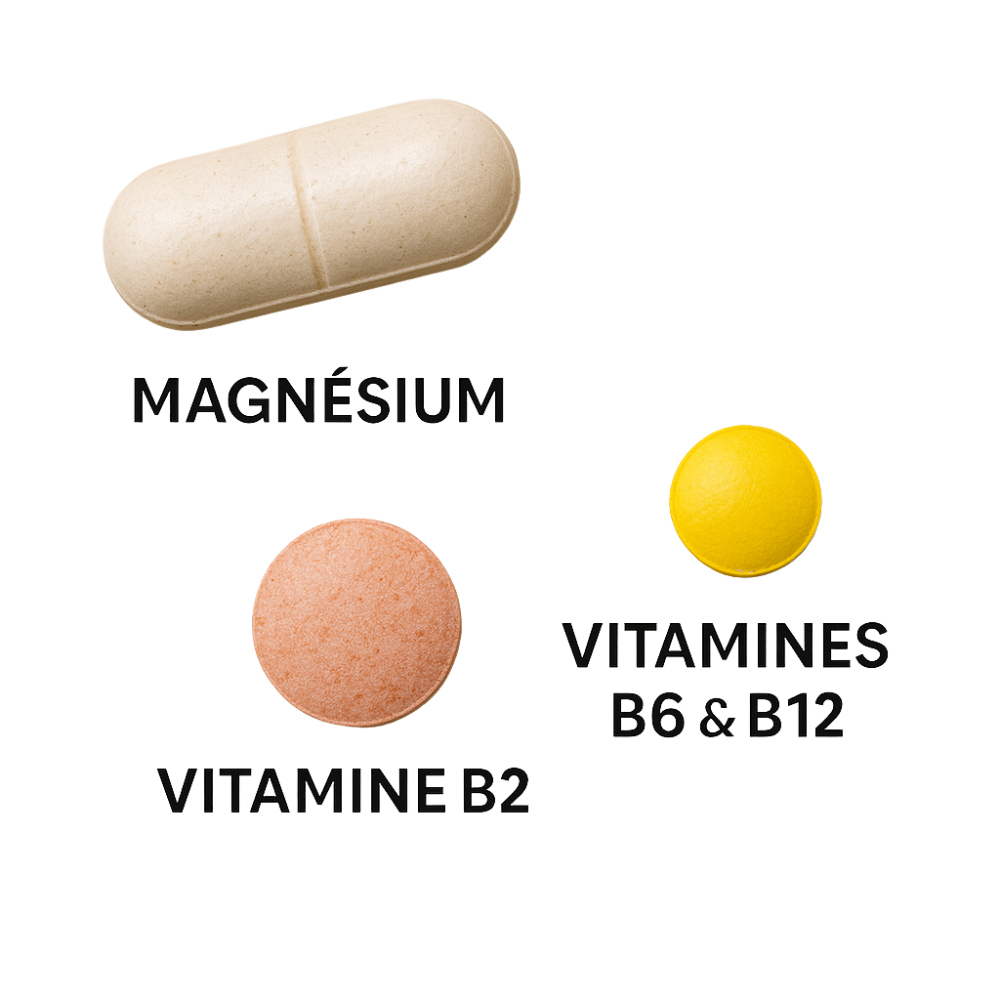 Grâce au magnésium + vitamines B2 / B6 / B12 qui contribuent à une fonction psychologique normale, réduisent la fatigue mentale et favorisent une humeur plus stable.